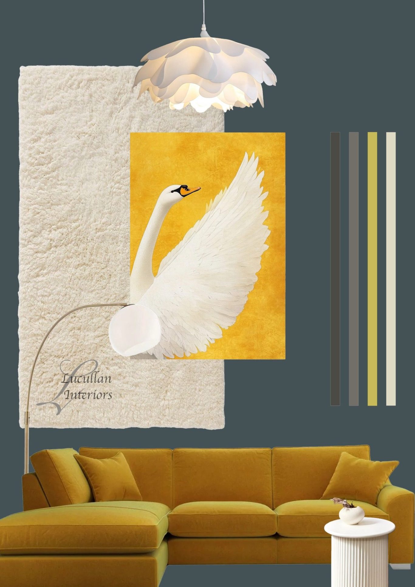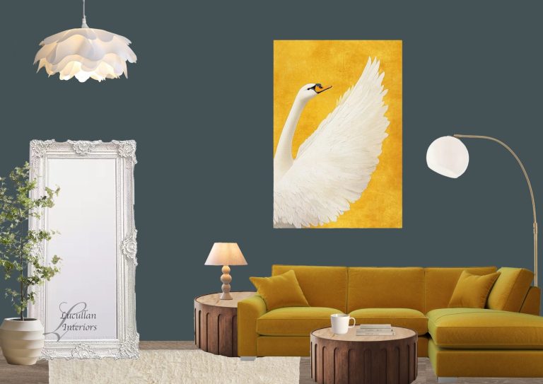 A perfect harmony of deep tones and radiant warmth — this space celebrates contrast. The rich charcoal wall sets the stage for the golden sofa and artwork, evoking confidence and sophistication. Natural textures and sculptural lighting add balance, making every detail a statement of timeless beauty.