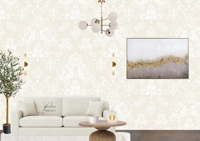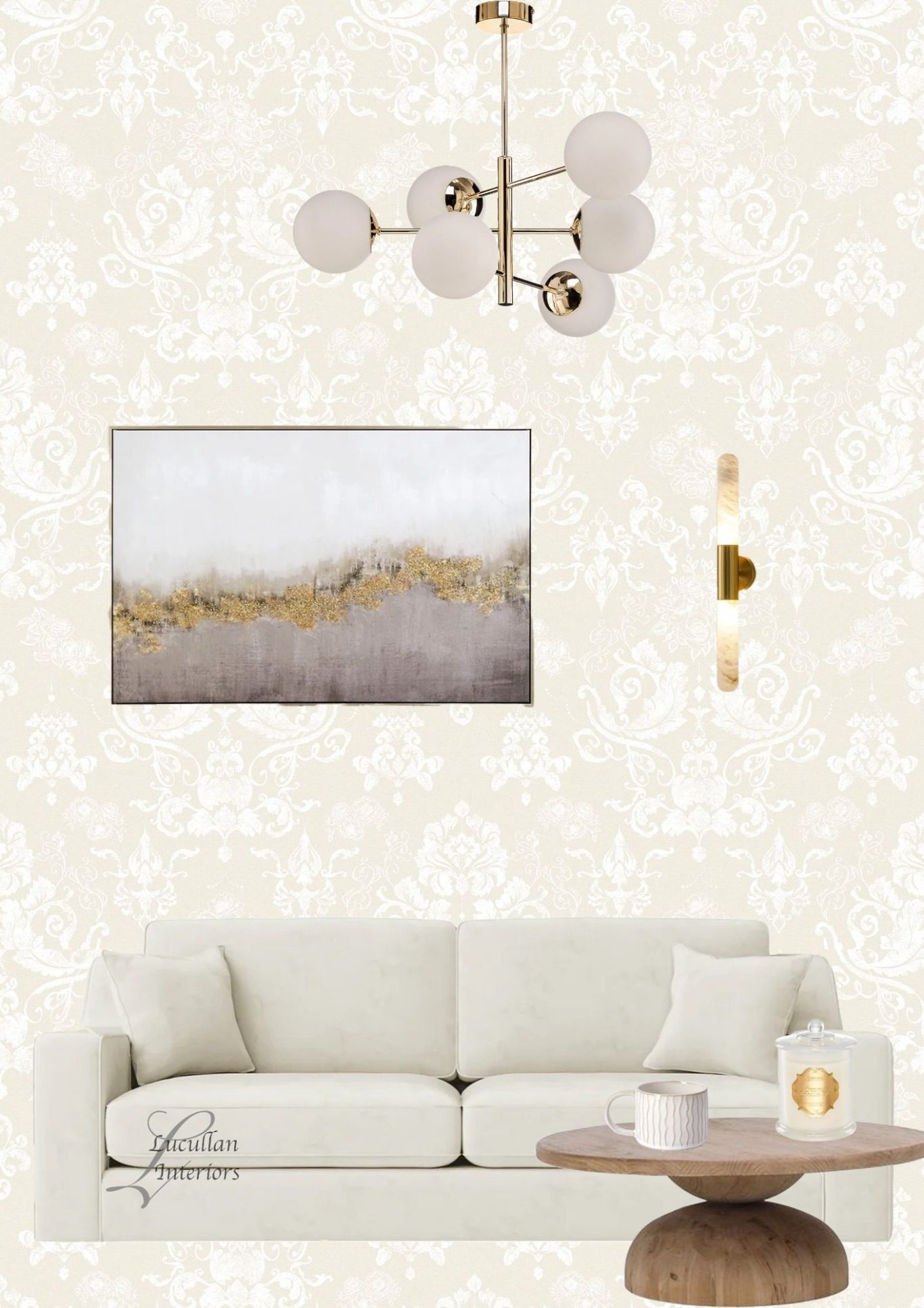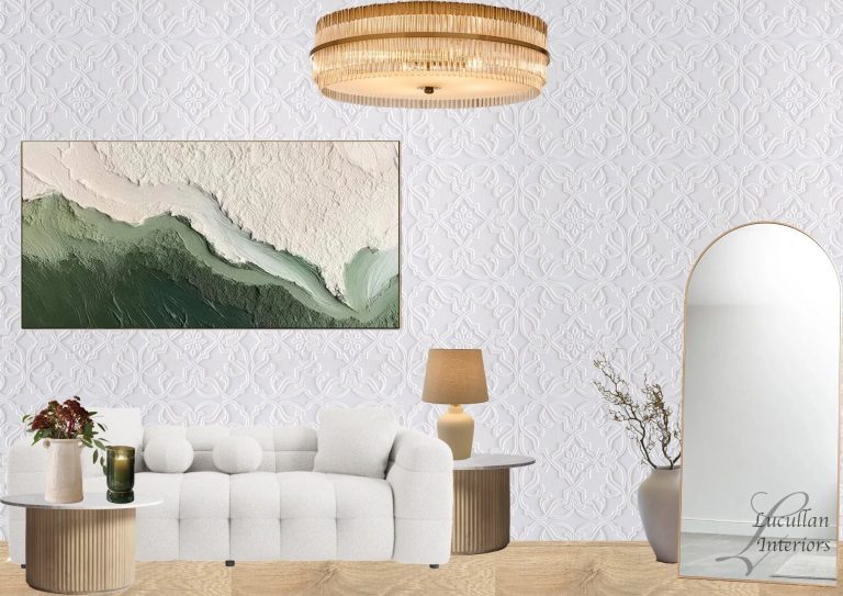 a serene blend of textures and tones - from the soft curves of the tufted sofa to the golden glow of the chandelier. The embossed wall adds quiet sophistication, while earthy accents and abstract art brings calm balace to the space.