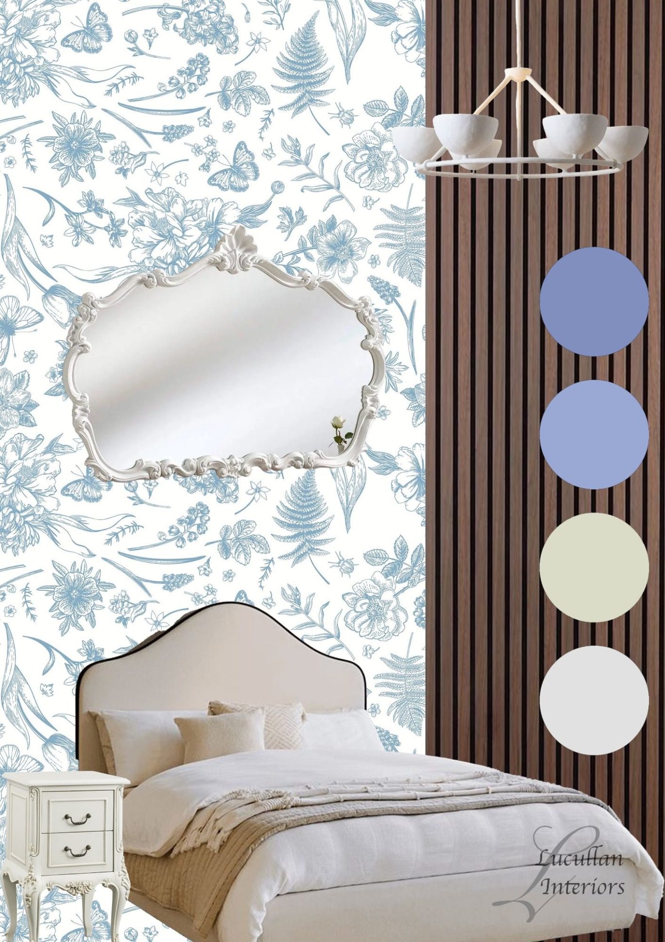 botanical wallpaper, sculpted details, and soothing blue tones layered with warm wooden texture's.